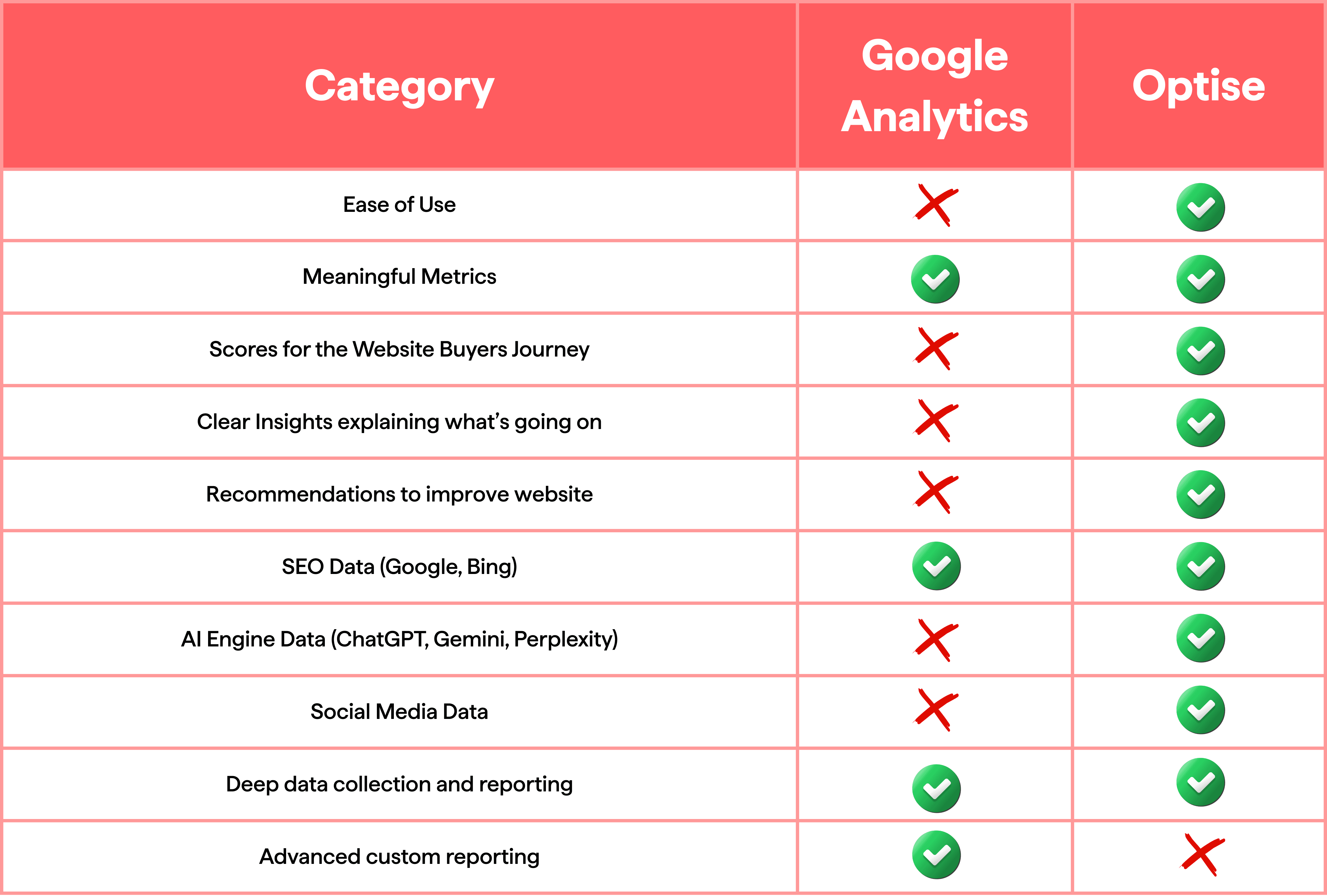 Google Analytics does not show visibility across Google, AI answers or social. Optise does.