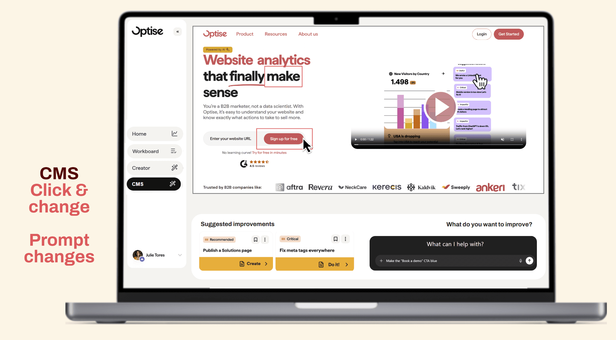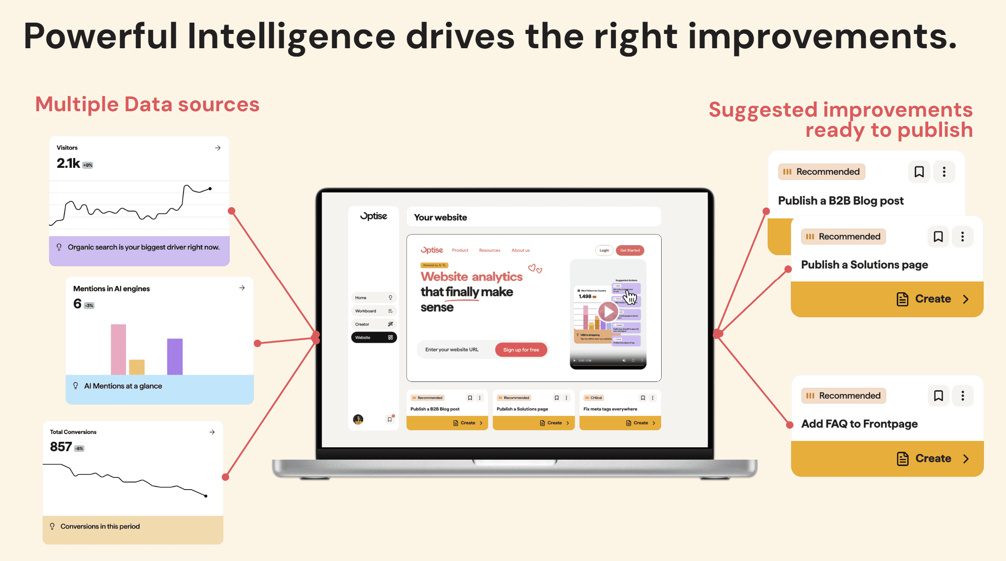Optise brings automated improvements, a super user friendly CMS, a content creator and powerful website analytics into one unified platform. Instead of logging into five different systems, teams operate from one place. The analytics do not just show dashboards. They identify friction and suggest specific actions. In many cases, they can implement those improvements automatically.